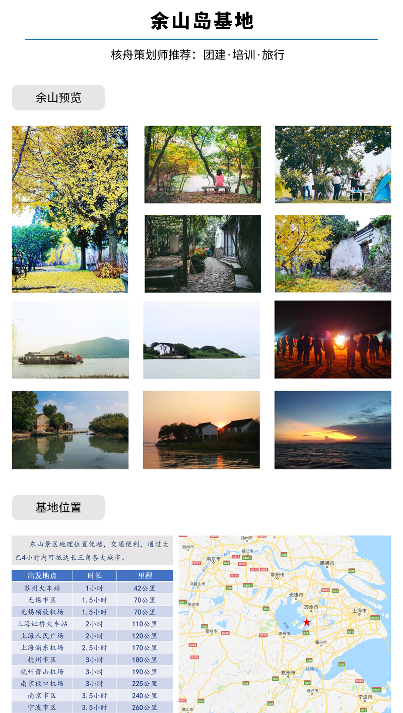 余山島基地位于蘇州市東山景區的太湖水域內。余山島,是太湖四十八島,七十二峰眾里其一。余山島面積約600畝,距離陸地最近處約1.5公里。余山島2002年完成通電,是蘇州最后一個通電的地方,島上主要由東灣和西灣兩個村組成,目前兩村共住著30余戶人家,且多為老人,村落都保存著原始的風貌。全島盛產茶葉、楊梅、枇杷和桔子等。